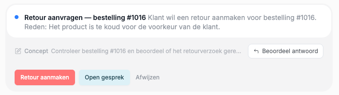 De Action Hub is het dashboard waar al die beslismomenten samenkomen. De AI-agent escaleert automatisch wanneer een actie goedkeuring vraagt. Je medewerker ziet: de klantcontext, de bestelhistorie, de voorgestelde actie en de reden van escalatie. Eén klik om goed te keuren of af te wijzen.