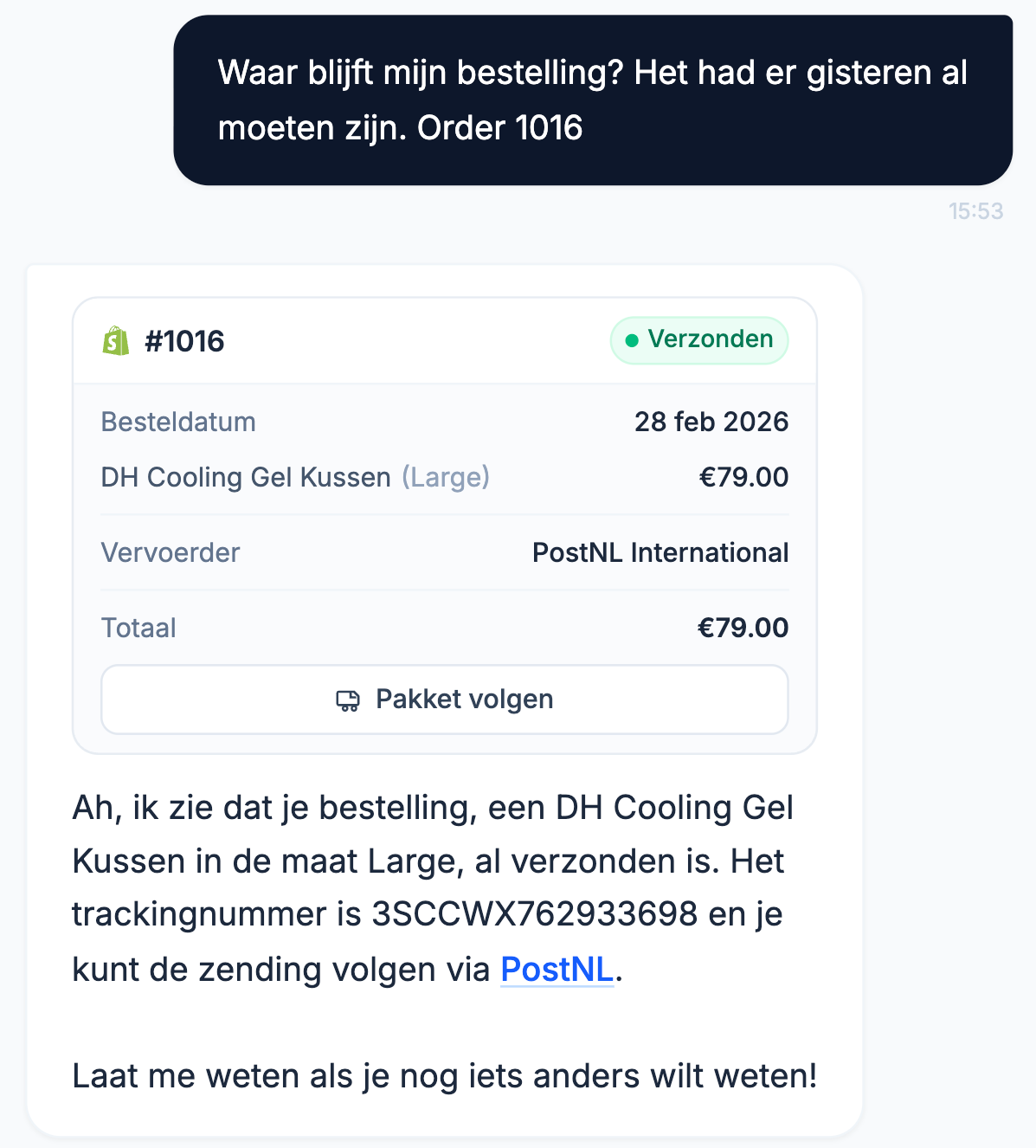 - Als er een Sendcloud-koppeling is, haalt de agent ook de actuele pakketstatus op (bijvoorbeeld: "onderweg, verwachte levering morgen tussen 14:00 en 16:00").