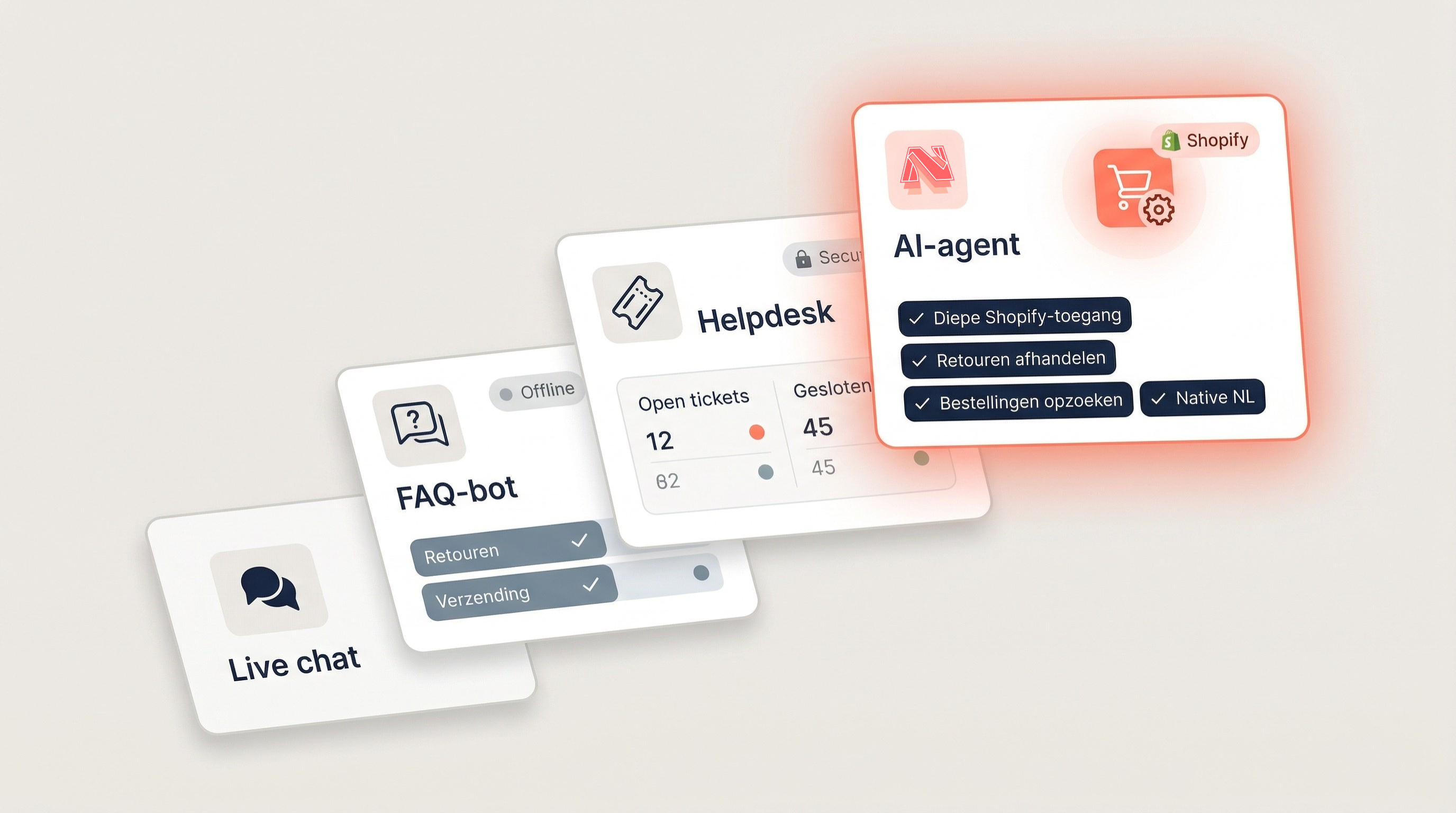 Vier categorieën tools die je in 2026 tegenkomt als je een chatbot voor je Shopify-webshop zoekt. Per categorie: wat het doet, wat het kost en waar het stopt.